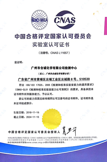 2018年11月16日,合誠技術股份有限公司旗下檢測機構“廣州市合誠化學有限公司檢測中心”正式通過中國合格評定國家認可委員會(CNAS)的認可,取得CNAS認可證書。至此,我司中心已經具備按照相應認可準則開展檢測服務的技術能力,技術水平和能力達到了國際標準。