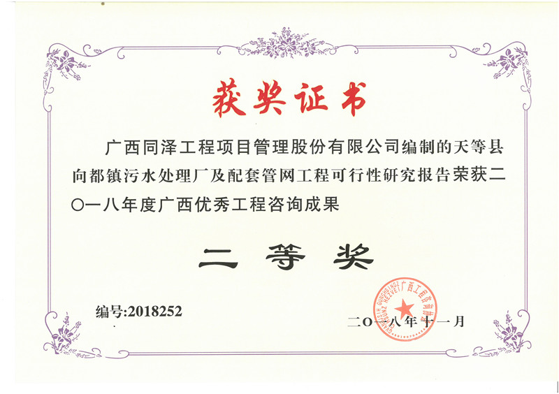 天等縣向都鎮(zhèn)污水處理廠及配套管網(wǎng)工程可行性研究報告榮獲2018年度廣西優(yōu)秀工程咨詢成果二等獎