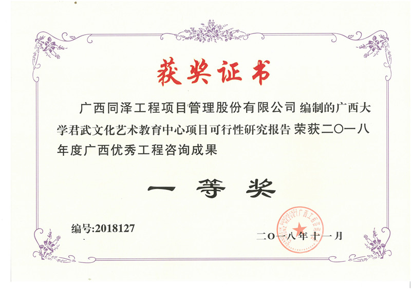 廣西大學(xué)君武文化藝術(shù)教育中心項(xiàng)目可行性研究報(bào)告榮獲2018年度廣西優(yōu)秀工程咨詢成果一等獎