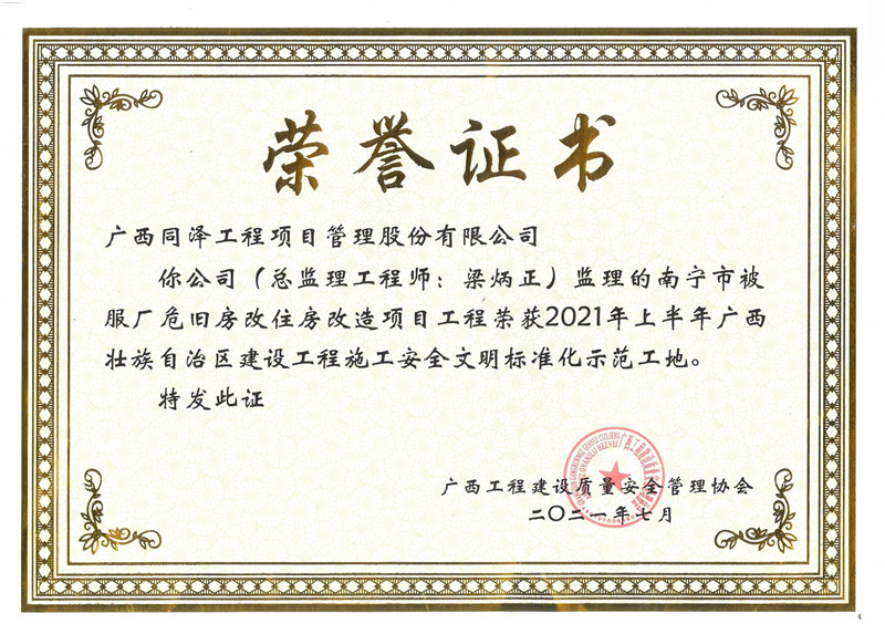 南寧市被服廠危舊房改住房改造項(xiàng)目榮獲2021年度安全文明標(biāo)準(zhǔn)化工地