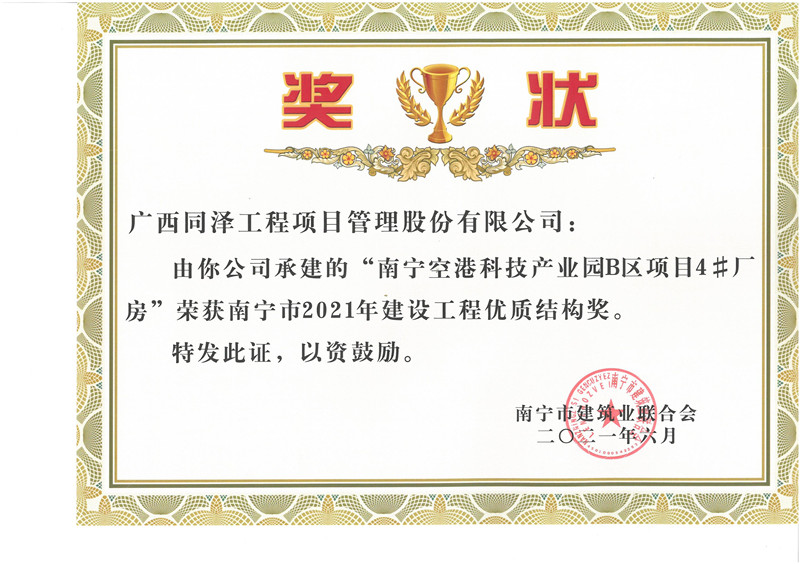 南寧空港科技產(chǎn)業(yè)園B區(qū)4#廠房項(xiàng)目榮獲2021年度建設(shè)工程優(yōu)質(zhì)結(jié)構(gòu)獎(jiǎng)