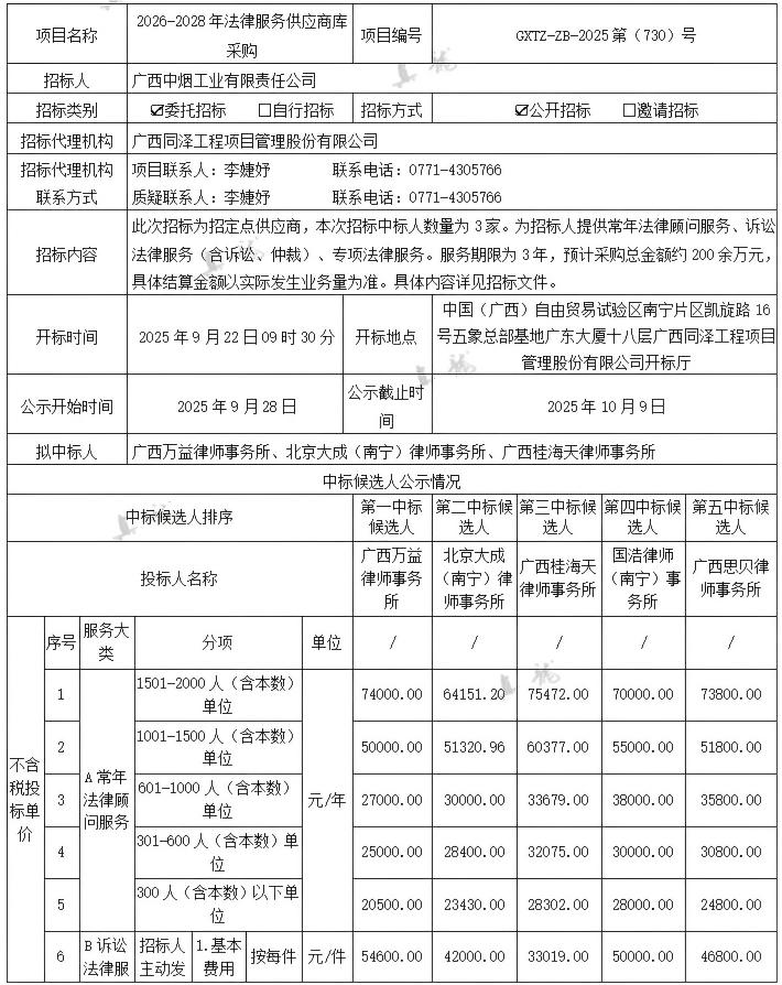 廣西中煙工業(yè)有限責任公司2026-2028年法律服務(wù)供應(yīng)商庫采購(項目編號:GXTZ-ZB-2025第(730)號)中標候選人公示